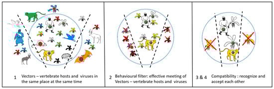 Just this intrinsic biology of the mosquito is not sufficient to make it a vector. Its environment may, or may not, allow this vector potential to manifest itself. According to Euzet and Combes [33], the specificity of the vector–pathogen interaction passes through four stages, which they named encounter and compatibility filters (Figure 2). These four stages are: (1) to co-occur in space and time, (2) to meet each other (behavior), (3) to recognize each other (receptors), and (4) to accept each other (immunity).