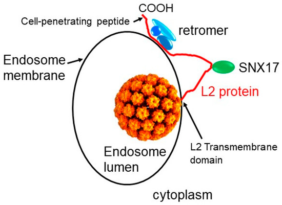 Based on the sequence similarity between the basic segment of L2 and cationic CPPs, we hypothesized that the L2 basic segment might act as a CPP to deliver the L2 protein not across the plasma membrane but rather across the endosome membrane into the cytoplasm so that it could bind retromer and other HPV entry factors. Standard membrane translocation assays with the L2 basic sequence as a free-standing peptide or fused to GFP showed that it indeed has cell penetrating activity [45]. Mutant HPV16 pseudoviruses containing mutations that disrupt the CPP sequence are defective for virus entry and accumulate in the endosome, as is the case when retromer is knocked down or the retromer binding sites are mutated. These defects are rescued by replacing the L2 CPP with the CPP from HIV tat. Furthermore, split-GFP assays in infected cells show that, as predicted, mutations in the L2 CPP prevent membrane protrusion. Taken together, these experiments showed that a CPP at the C terminus of L2 mediates protrusion of the protein through the endosome membrane into the cytoplasm during entry so that it can directly engage retromer, which delivers HPV into the retrograde transport pathway ( Figure 1; Figure 2).