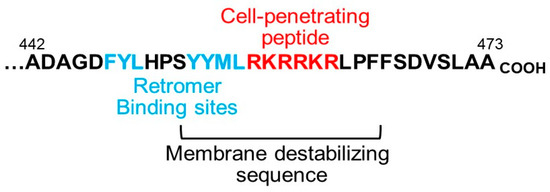 Essential sequence elements in the C terminus of the L2 protein. The C-terminal sequence of the HPV16 L2 protein is shown with the retromer binding sites, the cell-penetrating peptide, and the approximate extent of the membrane-destabilizing sequence indicated [42,44,45]. Of the two retromer binding sites, phenylalanine-tyrosine-leucine (FYL) is better conserved and more important in HPV entry. The numbers show the amino acid in L2.