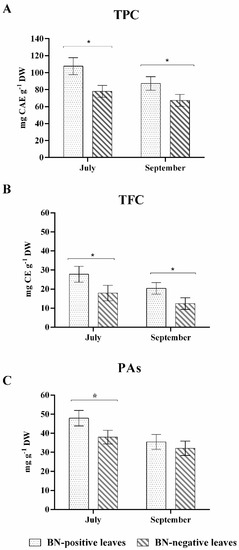 On the other hand, the differences between the BN-negative and BN-positive leaves in PA amount was statistically significant only in July with higher values in the BN-positive leaves (+26%) despite the samples not clearly showing symptoms of BN disease. The BN-positive leaves sampled in September, with clear symptoms of phytoplasma disease, did not show differences in the amount of PAs compared to the BN-negative leaves sampled at the same stage (Figure 2).