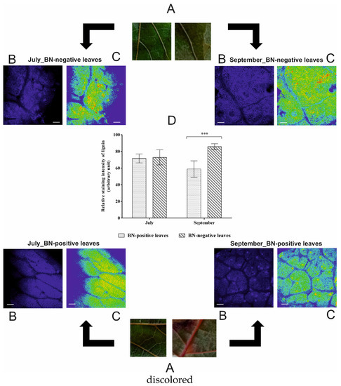 (A,B) Phenotype and lignin auto-fluorescence of hand cross sections of BN-positive and BN-negative leaves of grapevines cv. Sangiovese in July and in September; (C) Intensities of autofluorescence signals are represented in false rainbow colors (highest intensity in red and the lowest intensity in blue); (D) Quantification of the intensity of autofluorescence signal. The statistical analysis between BN-positive and BN-negative was carried out using multiple t-test (FDR = 5%) and significant differences at p < 0.001 are marked by three asterisks. Bar: 100 µm.