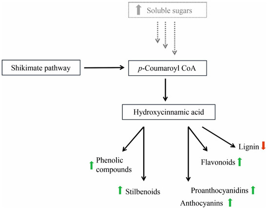 The biosynthetic pathways of phenylpropanoids and possible alterations in grapevine cv. Sangiovese leaves infected by Bois noir phytoplasma in relation to the increase in soluble sugars. Green arrows indicate the increase in metabolites, red arrows indicate the decrease in metabolites.