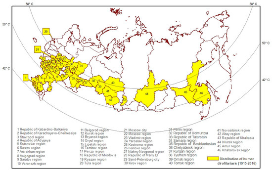 Distribution of human dirofilariasis, Russia, 1915–2016.
