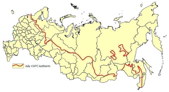 To construct a map, long-term average air temperature data for the month of July were obtained from the Meteorological Office of Russia for the period 1937–2016. July is the warmest month of the year, with the highest density of vectors and microfilariae in the blood of infected dogs. An isotherm of +14 °C for July was chosen as the northern border of a potential dirofilariasis endemic area in the territory of the Russian Federation.