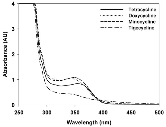 Ultraviolet A absorbance curves of tetracycline (TC), doxycycline (DXY), minocycline (MIN), and tigecycline (TGE).