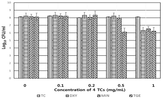 Antibiotic activity against C. difficile by the four TCs alone was seen at 2 mg/mL (TC), 0.5 mg/mL (DXY, MIN), and 0.2 mg/mL (TGE), respectively. To elucidate the antimicrobial activity of TCs themselves, we tested PDT of four TCs at low concentrations (0.05 and 0.1 mg/mL).