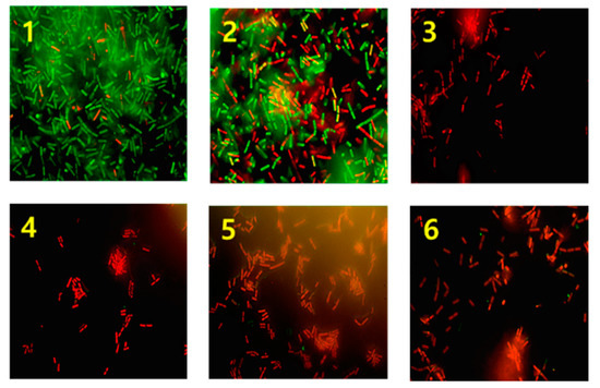 Fluorescence microscopy: the difference in bacterial membrane integrity after photodynamic therapy with UVA plus chitosan. 1. Control, almost green colored live cells stained with SYT09 are visible. 2. Irradiation with UVA only. 3. Irradiation of UVA with 0.2mg/mL of TC + chitosan. 4. Irradiation of UVA with 0.2 mg/mL of DXY + chitosan. 5. Irradiation of UVA with 0.2mg/mL MIN + chitosan. 6. Irradiation of UVA with 0.2 mg/mL of TGE + chitosan. In case of image 2-6, red cells indicate dead bacteria detected by the dye (propodium iodide) penetration via the damaged membrane with PDT for thirty min.