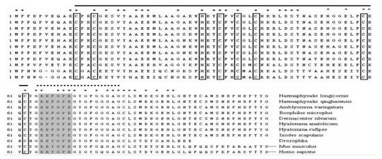 Comparison of the amino acid sequence of Haemaphysalis longicornis MLP (HLMLP) with the sequences of representative MLP orthologues from other ticks (Haemaphysalis qinghaiensis (HqMLP), Hyalomma anatolicum (HaMLP), Hyalomma rufipes (HrMLP), Boophilus microplus (BmMLP), Dermacentor silvarum (DsMLP), Ixodes scapularis (XP_002434065.1), and Amblyomma variegatum (DAA34746.1)) and those from Drosophila melanogaster (NP_788435.1), Homo sapiens (NP_003467.1), and Mus musculus (NP_038836.1). The conserved cysteine and histidine residues (white boxes), glycine-rich region (dotted line), LIM domain (solid line), and putative nuclear targeting signal (light grey boxes) are indicated.