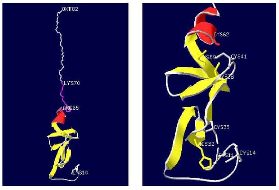 The 3D-modeled structure of MLP from the tick Haemaphysalis longicornis. (Left: overall structure of MLP protein; Right: the partial amino acid detailed structure folding of MLP) This model was constructed based on the crystal structure of chicken CRP2 (1b8t) using the SWISS-MODEL server. The α-helix is indicated in red, while the β-strand is indicated in yellow. The putative nuclear targeting signal (RKFGPK) is indicated in pink, and the numbers indicate the amino acid sites.