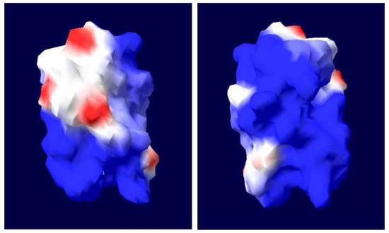 Predicted surface structures of the LIM domains in MLP (Left: Front views of LIM; Right: back views of LIM). Front and back views of the surface structures of the LIM domains are shown, revealing the differential distributions of hydrophobic residues and of the electrostatic surface potential within the domains. In the surface structures, hydrophobic, positively charged, and negatively charged residues are shown in white, blue, and red, respectively. The electrostatic surface potential was calculated using the program Swiss PDB Viewer.