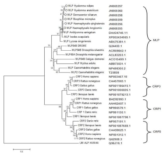In the predicted phylogenetic tree (Figure 5), the MLPs of ticks clustered onto the same branch as those of other lower organisms, termed the MLP-like subset. All vertebrate CRPs diverged into three subtypes, CRP1, CRP2, and CRP3. The evolutionary distance between tick MLP and CRP3 was shorter than that between MLP and the other two subtypes. Taken together, these results suggest that the CRP protein family evolutionarily diverged from the common ancestor gene by at least two gene duplication events [26]. Some invertebrates, such as Drosophila and C. elegans, contain two members of the CRP family. However, whether there is only one MLP isoform in ticks needs to be further confirmed.