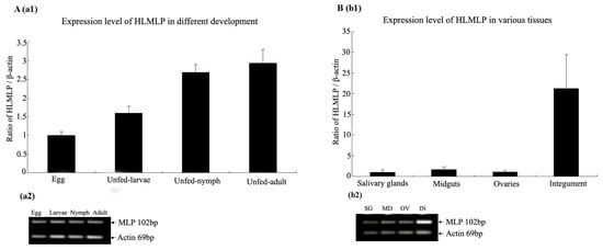 Overall, the levels of HLMLP expression in the integument were significantly higher than those observed in the midgut, salivary glands, and ovaries, and the distribution of MLP gene expression in H. longicornis was tissue specific.