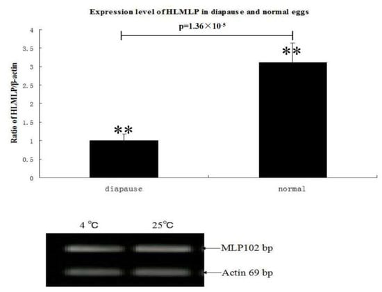 To determine whether HLMLP expression in eggs varied under temperature-induced stress, one portion of the tick eggs was maintained at 4 °C for 48 h, while the other portion was heated (25 °C for 2 h). RT-PCR analysis results showed that HLMLP expression levels were significantly upregulated by the heat treatment. When comparing the relative HLMLP expression levels at different temperatures, the results showed that HLMLP was significantly higher in eggs maintained at 4 °C than in the 25 °C treatment group (Figure 7).