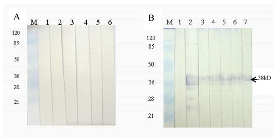The expression of rMLP was assessed by SDS-PAGE. The expected molecular weight of rMLP, including with the GST tag, was 38 kDa in a 12% polyacrylamide gel. Western blot analysis revealed strong reactivity of rabbit anti-H. longicornis adult serum with the rMLP-GST proteins from different ticks, while rabbit negative serum did not react with the fusion proteins. Thus, the rMLPs of different ticks showed strong cross-reactivity with rabbit anti-H. longicornis adult serum (Figure 8).
