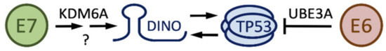 - Sharma, S.; Munger, K. KDM6A mediated expression of the long noncoding RNA DINO causes TP53 tumor suppressor stabilization in Human Papillomavirus type 16 E7 expressing cells. J. Virol. 2020, 94, e02178-19. [Google Scholar] [CrossRef]