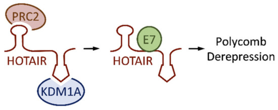 | HOTAIR | Decreased polycomb repression | Binding to HPV E7 | [79] |