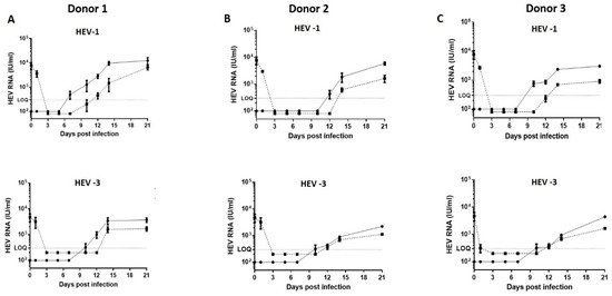 Hepatitis E virus (HEV) RNA kinetic in PHESCs challenged with HEV preparations. PHESCs, isolated from different donors, were challenged with stool-derived HEV-1 (upper panels) or stool-derived HEV-3 (lower panels), then the lysis of cells and/or collection of supernatants were done at 0, 1, 3, 5, 7, 10, 12, 14 and 21 days post-infection. (A) represents PHESCs isolated from donor #1, (B) represents PHESCs isolated from donor #2, and (C) represents PHESCs isolated from donor #3. The HEV RNA load was quantified in these samples by qPCR. The solid line represents intracellular HEV RNA load, the dotted line represents extracellular RNA load, and LOQ is the limit of quantification. Depicted are the mean values of three independent experiments ± SEM.