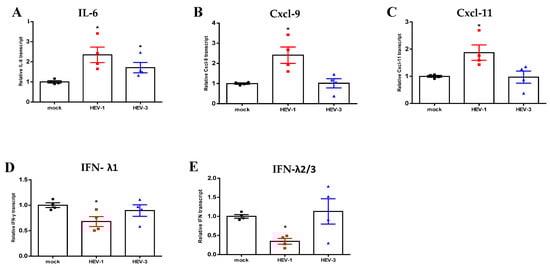 Then, we asked if HEV infection affects the transcriptome of PHESCs. To verify this point, PHESCs were challenged with HEV-1 and/or HEV-3 for 7 and 10 days, respectively, and then total RNA was extracted and assessed for selected inflammatory and IFN transcripts. We analyzed the gene expression in PHESCs at the early time points when HEV RNA started to be detectable intracellularly. The intracellular RNA load was 700 and 500 IU/mL for HEV-1- and HEV-3-infected cells, respectively. Interestingly, we found that HEV-1 induced proinflammatory transcripts, such as Cxcl-9, Cxcl-11, and IL-6 transcript, while TNF-α, IL-β, MCP-1, Cxcl-10, IL-15, and IL-8 were not affected. On the other hand, HEV-3 infection only upregulated the IL-6 transcript and did not affect the expression of the other transcripts (Figure S3). Regrading IFN transcripts, HEV-1 downregulated type III IFN (IFN-λ1, IFN-λ2/3), while type I and II IFN (IFN-α, IFN-β, IFN-ɤ) were not changed (Figure S2). The expression of IFN transcripts was not altered by HEV-3 infection (Figure 4).