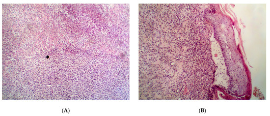 Histological examination of the defects upon recovery showed that infection of the wounds with C. albicans did not stop spontaneously for 14 days. In Figure 7A, massive infiltration of the mast cells at the stage of degranulation is visible. Therefore, the infection with C. albicans looks more resistant and aggressive than that with bacterial pathogens. Treatment with the reference preparation provided no elimination of the inflammation by the 14th day of the experiment, and massive infiltration of the mast cells is observed. The results of microbiological assay (Table 15) show that, as in the case of bacterial infection, distribution of the C. albicans yeast was uneven, and a more accurate quantification of antibacterial efficacy of the drugs requires wider experimental groups. However, the growth of yeast load from the 3rd to 10th days and its subsequent return to an undetectable level by the 14th day is clearly seen in all subgroups. The presence of small or extensive inflammation that focuses in all of the subgroups, except for the Resveratrol and Dihydromyricetin ones (Figure 7), enables us to conclude that the complete elimination of C. albicans from the wounding defect by the 14th day is doubtful. However, a substantial reduction of the yeast cell load in the wound is evident. The best result was clearly obtained in the Resveratrol subgroup vs. the other subgroups (including the Control one).