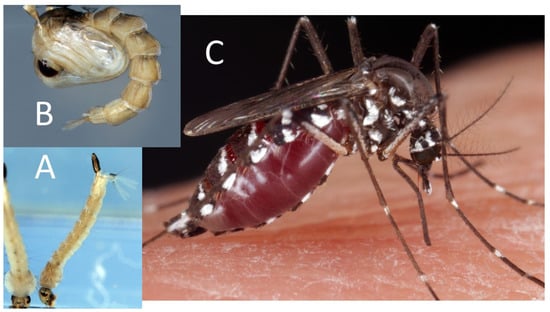 Aedes albopictus strain: (A) larvae (personal images), (B) pupa (personal images), and (C) adult (personal images).