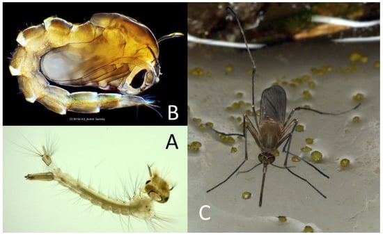 Anopheles gambiae: (A) larvae (personal images), (B) pupa (personal images), and (C) adult (personal images).
