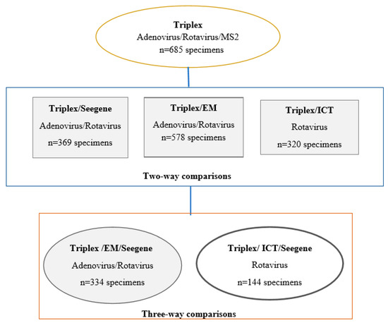 A total of 334 specimens were tested by triplex assay, EM and Seegene assay for the detection of adenovirus and rotavirus (Figure 1 and Table 5A,B).