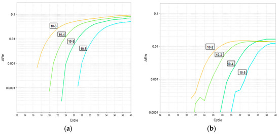 Figure 2 depicts partial results (replicates not shown) of a typical LOD experiment using 10-fold serial dilutions of quantified TCF. As seen in Figure 2, adenovirus was detected at 10−6.5 TCID50/mL (Figure 2a) and rotavirus was detected at 10−5.6 TCID50/mL (Figure 2b). Using plasmid DNA, the 95% limit of detection in copies/reaction for adenovirus in the triplex assay was 0.45 copies or 30.8 genome equivalent and for rotavirus 4.5 copies or 10.2 genome equivalent. The estimated 95% LODs were 30.8 genome equivalent GEq/reaction for adenovirus and 10.2 GEq/reaction for rotavirus (results not shown).