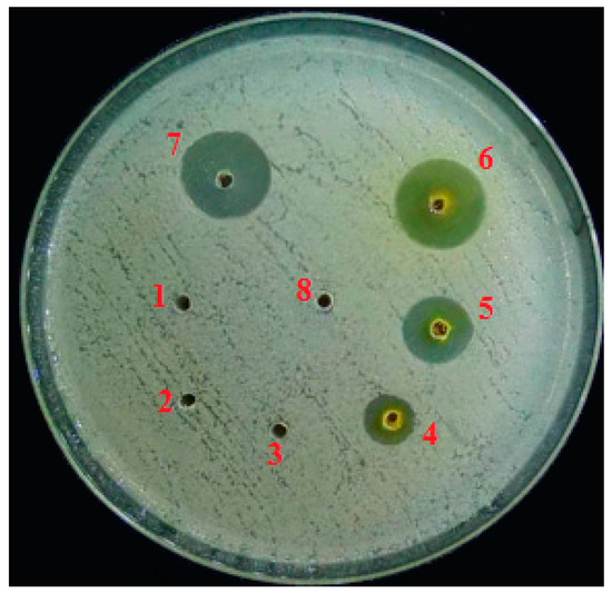 Growth of inhibition zones produced by ethanol extracts of Conyza canadensis against Ralstonia solanacearum. 1: 50 mg/mL, 2: 100 mg/mL. 3: 150 mg/mL. 4: 200 mg/mL, 5: 250 mg/mL, 6: 300 mg/mL, 7: Ampicillin, 8: Methanol.