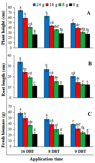Effect of Conyza canadensis dried powder doses (0 g, 8 g, 16 g and 24 g) and application time (0 DBT, 8 DBT and 16 DBT) applied to artificially inoculated soil with Ralstonia solanacearum on (A) plant height, (B) root length and (C) fresh biomass of tomato plants. Each value is a mean ± SD of 8 replicates. DBT: Days before transplanting. Mean values showing different lettering are significantly different (P ≤ 0.05) as per Fisher’s protected LSD test. Bars represent standard deviation.