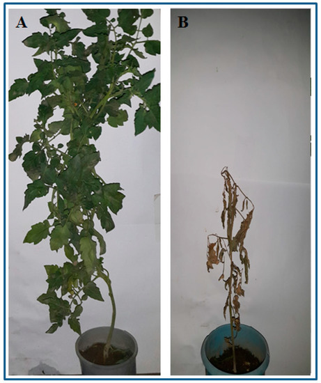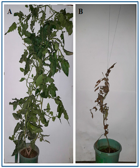 (A) Effect of dried plant powder at 24 g kg−1 inoculated soil applied 16 days before transplanting on growth of tomato plant and (B) Control (unamended soil).
