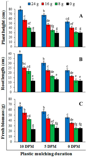 Effect of Conyza canadensis dried powder doses (0 g, 8 g, 16 g and 24 g) and plastic mulching duration (0 DPM. 5 DPM and 10 DPM) applied to artificially inoculated soil with Ralstonia solanacearum on (A) plant height, (B) root length and (C) fresh biomass of tomato plants. Each value is a mean ± SD of 8 replicates. DPM: Days plastic mulching. Mean values showing different lettering are significantly different (P ≤ 0.05) as per Fisher’s protected LSD test. Bars represent standard deviation.