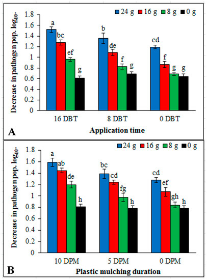 Effect of dried powder doses (0 g, 8 g, 16 g and 24 g), application time of Conyza canadensis and plastic mulching duration on decrease in soil pathogen population. (A) Application time and dose effect, (B) plastic mulching duration and dose effect. Each value is an average cfu/g dry soil (initial log10-final log10). DPM: days plastic mulching. DBT: days before transplantation. Mean values showing same lettering are not significantly different (P ≤ 0.05) as per Fisher’s protected LSD test. Bars represent standard deviation.
