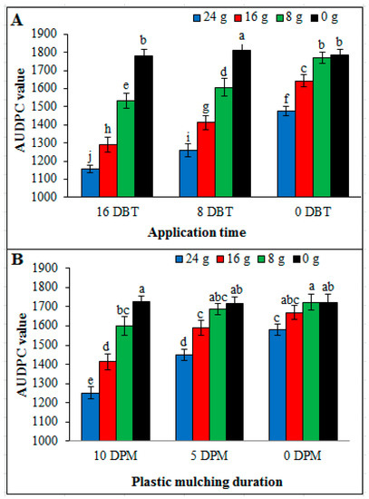 Effect of dried powder doses (0 g, 8 g, 16 g and 24 g), application time of Conyza canadensis and plastic mulching duration on AUDPC. (A) Application time and dose effect, (B) Plastic mulching duration and dose effect. DPM: days plastic mulching. DBT: days before transplantation. Mean values showing same lettering are not significantly different (P ≤ 0.05) as per Fisher’s protected LSD test. Bars represent standard deviation.