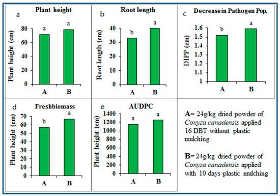 Comparison of Conyza canadensis dried powder at 24 g/kg soil, applied 16 days before transplantation (16 DBT) without plastic mulching and with 10 days plastic mulching (10 DPM). Mean values showing same lettering are not significantly different (P ≤ 0.05) as per Fisher’s protected LSD test. (a) Plant height; (b) Root length; (c) Decrease in Pathogen Pop.; (d) Freshbiomass and (e) AUDPC.