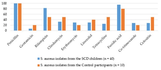 In both study groups, all the S. aureus isolates were penicillin-resistant. Moreover, relatively higher rates of resistance were observed for fusidic acid (95% in the SCD group vs. 80% in the control group) as well as rifampicin (82.5% in the SCD group vs. 50% in the control group), which was the only antibiotic whose differences in resistance rates reached statistical significance (z = 2.152; p = 0.03). The rates recorded against the other antimicrobials were: gentamicin (7.5% in the SCD group vs. 20% in the control group), clindamycin (32.5% in the SCD group vs. 50% in the control group), erythromycin (30% in the SCD group vs. 20% in the control group), linezolid (30% in the SCD group vs. 40% in the control group), tetracycline (25% in the SCD group vs. 50% in the control group), co-trimoxazole (27.5% in the SCD group vs. 20% in the control group), and cefoxitin (27.5% in the SCD group vs. 50% in the control group). The rates of multidrug resistance (resistance to more than two antimicrobial classes [41]) were 92.5% in the SCD group (n = 37) and 100% (n = 10) in the control group. In Figure 1, the prevalence rates of antimicrobial resistance are presented.