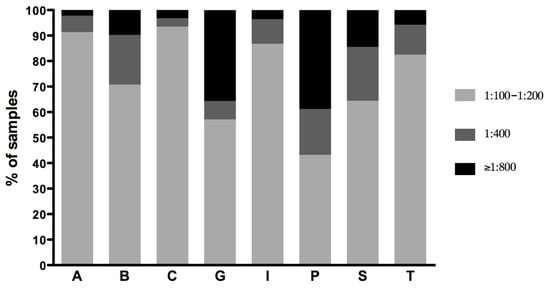 Distribution of MAT titers of samples reacting to one serogroup. Titers were grouped as low (1:100–1:200), medium (1:400) and high (≥1:800). A, Australis; B, Ballum; C, Canicola; G, Grippotyphosa; I, Icterohaemorrhagiae; P, Pomona; S, Sejroe; T, Tarassovi.