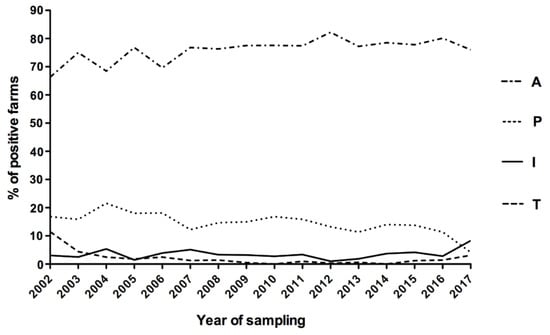 In this study, MAT, considered the gold standard and the most commonly used test, was used for serological identification. We tested 131,660 pig sera collected for 16 years. In 2002, there were 18,096 collected samples but the number progressively decreased each year to 2505 samples in 2017, except for a peak of 9330 samples in 2012. This trend may result from the strictness of the Italian national rules [,], in which the infection associated with a disease outbreak is only considered eradicated when all the affected animals become seronegative. This could require months or even years, and during this period, the herd is subjected to restrictive measures that are very penalizing and economically disadvantageous to the farm. Moreover, a better sampling strategy may have contributed to the reduced numbers of samples over the last few years. In fact, in the past, sampling had been carried out in all the livestock sectors, but in the last few years, perhaps for economic reasons, the trend has been to perform targeted sampling, mainly among reproductive or symptomatic animals.