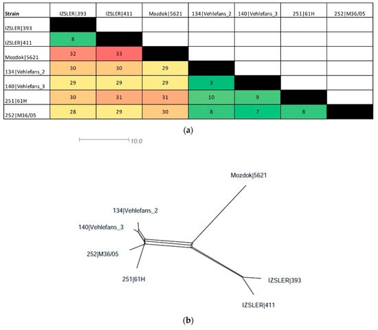 In total, 17 and 19 out of 545 alleles were revealed as “new” in isolates 393 and 411, respectively. In total, 14 occurred in both isolates 393 and 411 (Supplementary Table S3). The distance matrix (Figure 4a) was used to build a distance tree using SplitsTree software ver. 4.15.1 [] (Figure 4b).