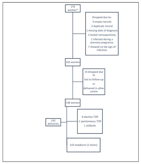 For the analysis, 16 were excluded because of empty (n = 3) or duplicate records (n = 2), missing date of diagnosis (n = 1), retrospective testing (n = 2), infection during a previous pregnancy (n = 1), or not meeting eligibility criteria (i.e., no indication of infection) (n = 7). Thus, this paper presents the data from 163 pregnant women and their infants included in the mother–child pair analyses (Figure 1).