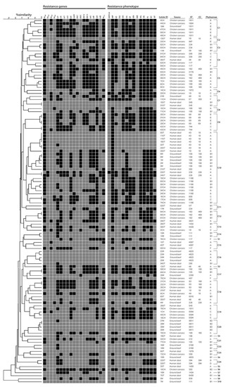 Based on PFGE analysis, clustering of the isolates with ≥75% similarity showed E. coli isolates from humans, chicken and beef were distributed into 34 PFGE types including 24 clusters assigned from C1 to C24 and 10 singletons (S1–S10). The 24 clusters encompassed at least two isolates that either belonged to one source (n = 8) or multiple sources (n = 16), known as mixed clusters; meanwhile, a singleton represented one isolate. Of the 16 mixed clusters, only three (C7, C10, C18) clusters contained isolates from all three sources. Meanwhile, the other 13 clusters included isolates from two different sources and were distributed as follows: seven clusters (C2, C4, C12, C13, C15, C19, C23) for isolates from humans and chicken, four clusters (C1, C3, C17, C20) for chicken and beef isolates, and two clusters for human and beef isolates (C11, C16). Cluster C10 was the largest cluster composed of 24 isolates (10 from humans, 9 from chickens and 5 from beef); the human isolate (20ST) harbored similar resistance genes to beef isolates (1M, 2M, 3M, 8M and 9M) except for the presence of blaCTX in human isolate and floR gene in beef isolates (Figure 1). In some mixed clusters, isolates from different sources were assigned to similar phylogroups (e.g., C1, C3, C10, C11, C18, C23).