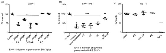 Three types of lipids were tested: positively charged DOTAP, negatively charged PS, and neutral PC. Equine dermal (ED) cells were treated with SUVs containing PS, PC, or DOTAP:PC (1:1), at a concentration of 200 μM or 300 μM for 3 h prior to infection with EHV-1. ED cells infected without previous SUV treatment were used as a control. Positively and negatively charged DOTAP and PS lipids significantly inhibited EHV-1 infection (Figure 1A). In contrast, neutral PC SUVs had no effect on virus infection. At a concentration of 300 μM of all lipid preparations, none of the SUVs significantly affected cell viability after a 24 h incubation period (Figure 1C).
