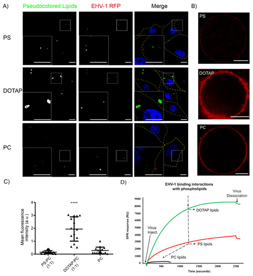 Virus interaction with phospholipids. (A) EHV-1-RFP (MOI = 5) was mixed with fluorescently labeled large unilamellar vesicles (LUVs) of PS, PC or DOTAP:PC (1:1). The mixture was applied to ED cells that were incubated for 1 h on ice. Green: pseudocolored fluorescently labeled LUVs; Red: RFP-labeled viruses; Blue: DAPI stained nucleus. Merge panels: dotted lines represent the boundaries of cells. Scale bar = 10 μm. (B) Binding of EHV-1-RFP to giant unilamellar vesicles (GUVs). Pictures of GUVs made of PS:PC (1:1), DOTAP:PC (1:1), and PC with bound RFP-labeled virus. Scale bars indicate 10 µm. (C) Quantification of the average signal in 15–21 GUVs from two independent experiments for each lipid compositions: PC, PC:PS (1:1), or DOTAP:PC (1:1). **** p < 0.0001 (one-way ANOVA with Dunnett’s test was used to correct for multiple comparisons). (D) Surface plasmon resonance (SPR) analysis of EHV-1 interactions with model membrane composed of neutral, cationic, or anionic phospholipids. Representative sensorgrams after curve alignment show the virus association to the immobilized lipid monolayer composed of DOTAP 100 mol%, PC 100 mol%, or PS 100 mol%. RU: corrected SPR response unit.