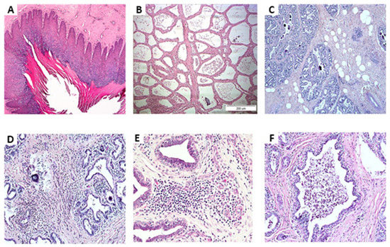 Microscope photographs: (A) Teat-end; (B) Lobule’s tissues of healthy glands of milk-producing cows; (C) Lobule’s tissues of healthy glands with non-milk producing areas and increased fat globules, with only a low number of leukocytes; (D,E) Lobule’s tissues of glands identified as inflamed but with no bacteria isolation, infiltration of mononuclear cells and neutrophils into the connective tissue, but not in the lobules lumen; (F) lobule’s tissues with high numbers of neutrophils.