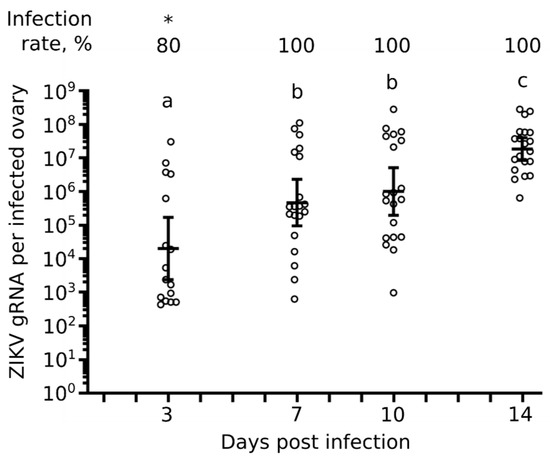 Kinetics of ovary infection. Zika virus (ZIKV) was quantified in single pairs of ovaries at 3, 7, 10, and 14 days post oral infection. Bars represent geometric means ± 95% CI. Each circle represents a pair of ovaries from one individual mosquito. N = 20 pair of ovaries per condition. * p-value < 0.05 from other conditions as calculated by Z-test. Different letters indicate significant difference (p-value < 0.05) as calculated by Tukey’s test.