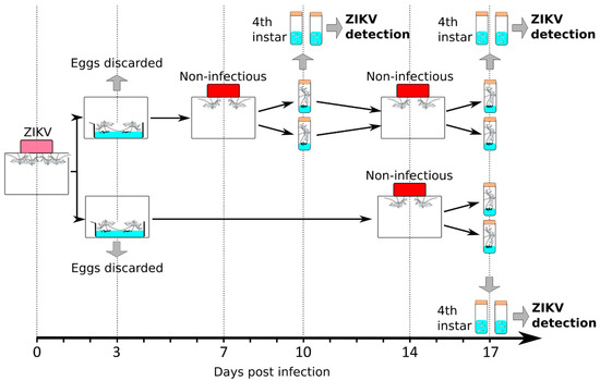 We designed an experiment to test the separate and interacting impacts of gonotrophic cycle and extrinsic incubation time on VT (Figure 2). Female mosquitoes were orally fed with 105 pfu/mL of ZIKV as above, resulting in 100% infected mosquitoes (Figure 1). To minimize variation due to mosquito batch, the same batch of ZIKV-infected mosquitoes was divided into two cages. For each cage, we separated individual blood-fed mosquitoes in tubes prefilled with water and monitored oviposition at 3 d.p.i. The eggs from the first gonotrophic cycle were discarded as it has been shown that VT does not occur or is minimal in the first gonotrophic cycle for other arboviruses [29,30]. Mosquitoes that had oviposited and, thus, gone through their first gonotrophic cycle, were regrouped in their respective original cages.