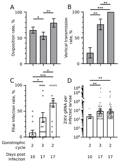 Infection rate in the ovaries was calculated by dividing the number of infected ovaries over the total number of ovaries that were tested. VT rate was defined as the percentage of infected females that transmitted the virus to their progeny [21] and was calculated by dividing the number of progeny with at least one infected larva to the total number of females that oviposited. Filial infection rate was calculated by dividing the number of larvae with detectable levels of ZIKV gRNA out of 10 tested randomly selected larvae within progeny. Oviposition rate was calculated by dividing the number of female mosquitoes that oviposited over the total number of mosquitoes that were singled out in the vials prefilled with water. Differences in infection rates per progeny and ZIKV gRNA copies were evaluated using Tukey’s multiple comparison tests. After evaluating distribution normality with D’Agostino omnibus K² test, ZIKV gRNA copies were log-transformed before statistical analysis. Differences infection rates in ovaries and oviposition rates were evaluated using Z-test. All tests were performed with Prism v8.0.2 (GraphPad, San Diego, CA, USA), except for Z-tests that were conducted with Systat v13.1 (Systat Inc., San Jose, CA, USA).