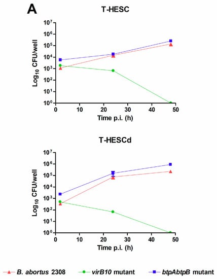 Both decidualized and non-decidualized T-HESC endometrial cells were infected with B. abortus at a multiplicity of infection (MOI) of 250 bacteria/cell, and colony-forming units (CFU) of intracellular bacteria were determined at different times post-infection (p.i.). As shown in Figure 1, B. abortus was able to infect T-HESC cells in both conditions, although the initial number of intracellular bacteria (2 h p.i.) was slightly higher for non-decidualized cells (1125 ± 250 vs. 345 ± 32 CFU/well, mean ± SD). Besides wild type B. abortus, two additional strains carrying mutations in genes relevant for virulence were also tested for their capacity to infect and survive in T-HESC cells. These included a mutant lacking the virB10 gene, widely reported as essential for the intracellular survival and replication of Brucella [33,34], and a double mutant lacking btpA and btpB genes which encode proteins able to interfere with TLR signaling [35,36]. As shown in Figure 1A, both mutant strains were able to infect decidualized and non-decidualized T-HESC at levels similar to the wild type strain. However, the ability to survive and replicate intracellularly differed between the virB10 mutant and the other two strains. While CFU of intracellular bacteria increased along time for wild type B. abortus and the btpAbtpB mutant, showing intracellular replication, the CFU of the virB10 mutant declined at the same time and no viable bacteria were detected in either condition at 48 h p.i. This later result confirmed in endometrial cells the essential role of virB10 for the intracellular survival of Brucella.