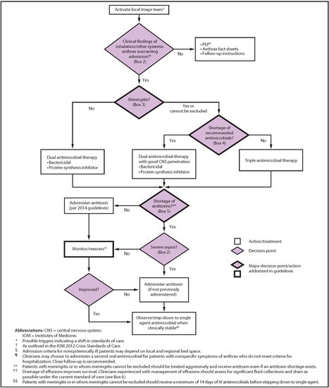 The CDC recommends prophylaxis with ciprofloxacin (500 mg PO bid) or doxycycline (100 mg PO bid) after inhalational exposure [57]. The 2019 CDC guidance includes recommendations for hemodynamic support and mechanical ventilation, adjunctive corticosteroids, antibiotic prophylaxis and treatment and prevention of the disease with vaccination with AVA at 0, 2, and 4 weeks in individuals who are suspected of having been exposed but do not have active disease. The guidance specifies “a 42-day antimicrobial regimen when initiated concurrently with the first dose of AVA or for 14 days after the last AVA dose, whichever is later (not to exceed 60 days) for immunocompetent adults as post-exposure prophylaxis” [58]. Furthermore, the guidance included the addition of an antitoxin to antimicrobial therapy in those patients in whom a systemic involvement is suspected. The CDC has developed a clinical framework for the management of a mass casualty incident illustrated in Figure 1 [34,35].