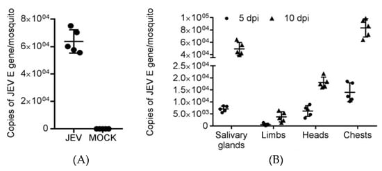 Detection of viral loads in mosquitoes. Female Cx. pipiens mosquitoes were intrathoracically mock-infected with DMEM or were infected with JEV at 100 PFU. (A) Five mosquitoes from the mock- and JEV-infected groups were randomly sampled at 10 dpi for detection of viral loads in whole mosquitoes by qRT-PCR. (B) Five mosquitoes from the mock- and JEV-infected groups were randomly sampled at 5 and 10 dpi, and the secondary organs including the salivary glands, limbs, head, and chest were dissected and subjected to detection of viral loads by qRT-PCR. Each dot represents an individual mosquito.