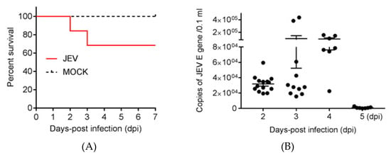 Survival curve and RNAemia. Ducklings (n=20) were exposed to mock- and JEV-infected mosquitoes and were monitored daily for seven days. (A) Survival curve. (B) Blood samples were collected at 2 (n = 14), 3 (n = 11), 4 (n = 7), and 5 dpi (n = 7) for analysis of RNAemia by qRT-PCR. Each dot represents an individual duckling.